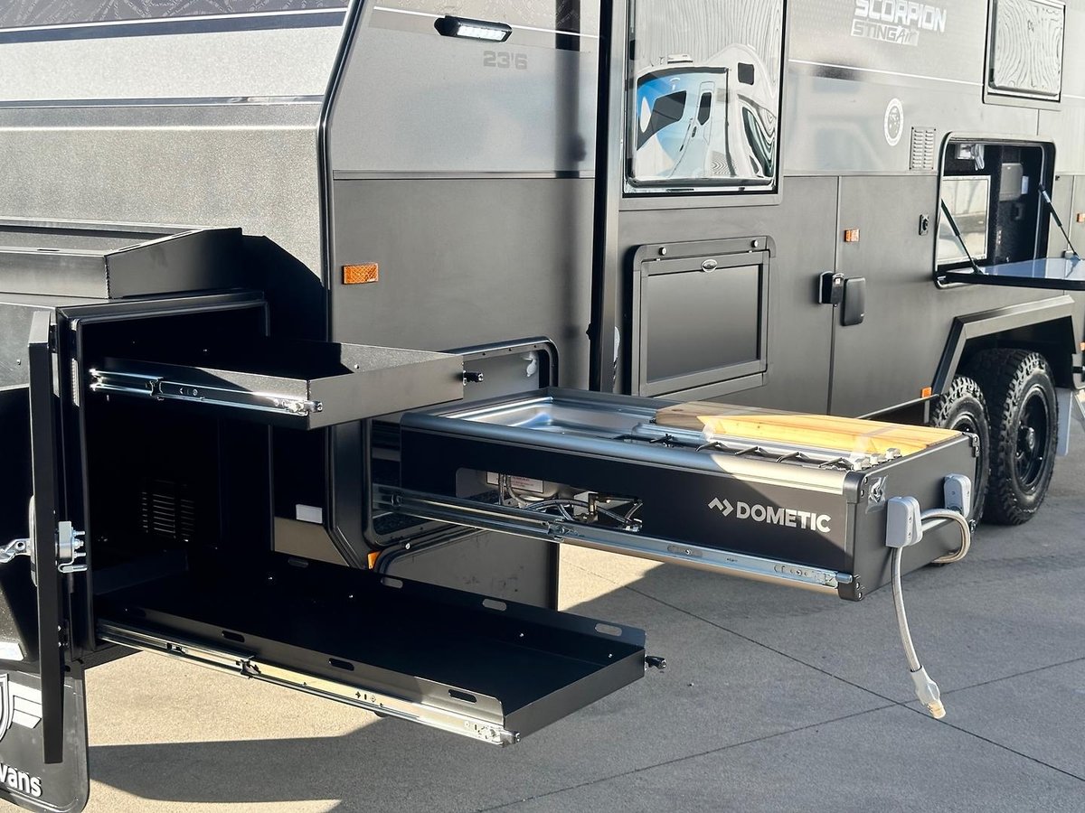 - New 2025 Raptor Coated Toolbox with built in stone guard and wood box and Slide Out Drawers for your gas bottles and fridge/BBQ slide so you can organize and access your gear with ease.