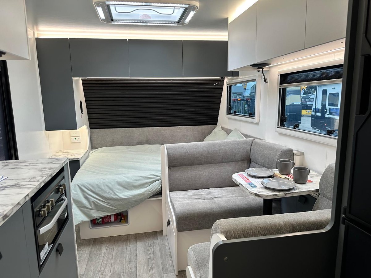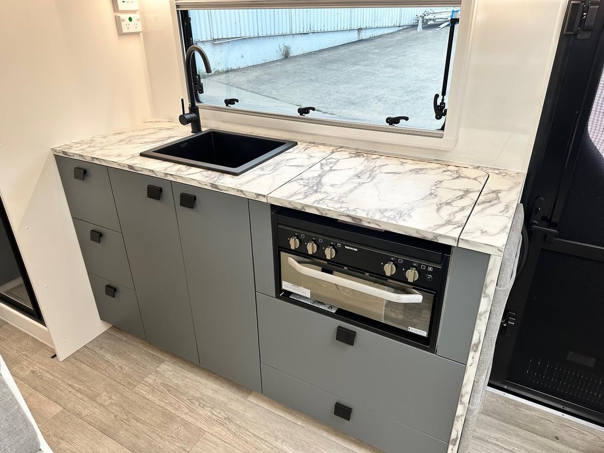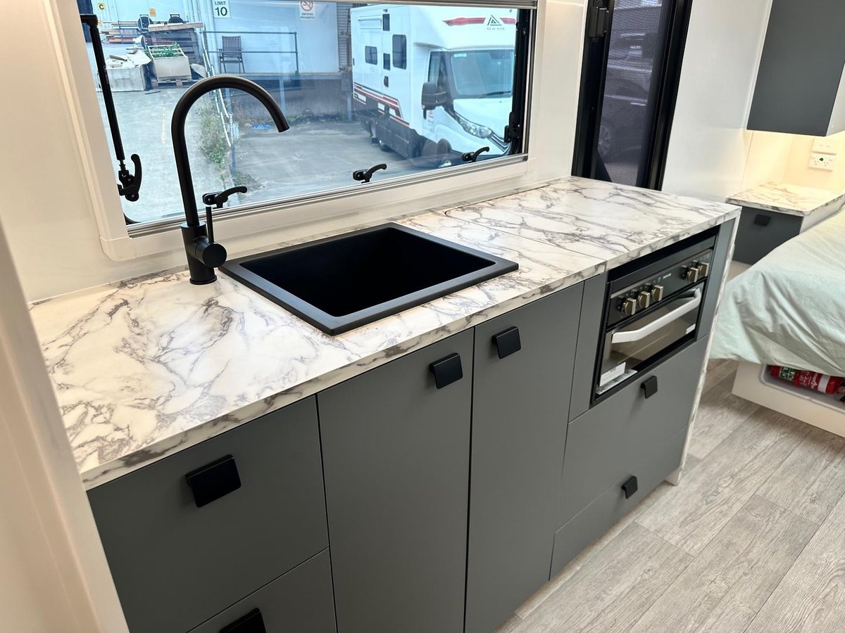 This year’s model debuts a new curved robe design, thicker 25mm benchtops, and a relocated kitchen to the doorside for improved flow. The toilet has been repositioned to the roadside, creating a more efficient interior layout. Convenience is built in, with internal and external USB-C charging, a single-bowl sink without drainer, and acoustic paneling that enhances interior comfort and style.
