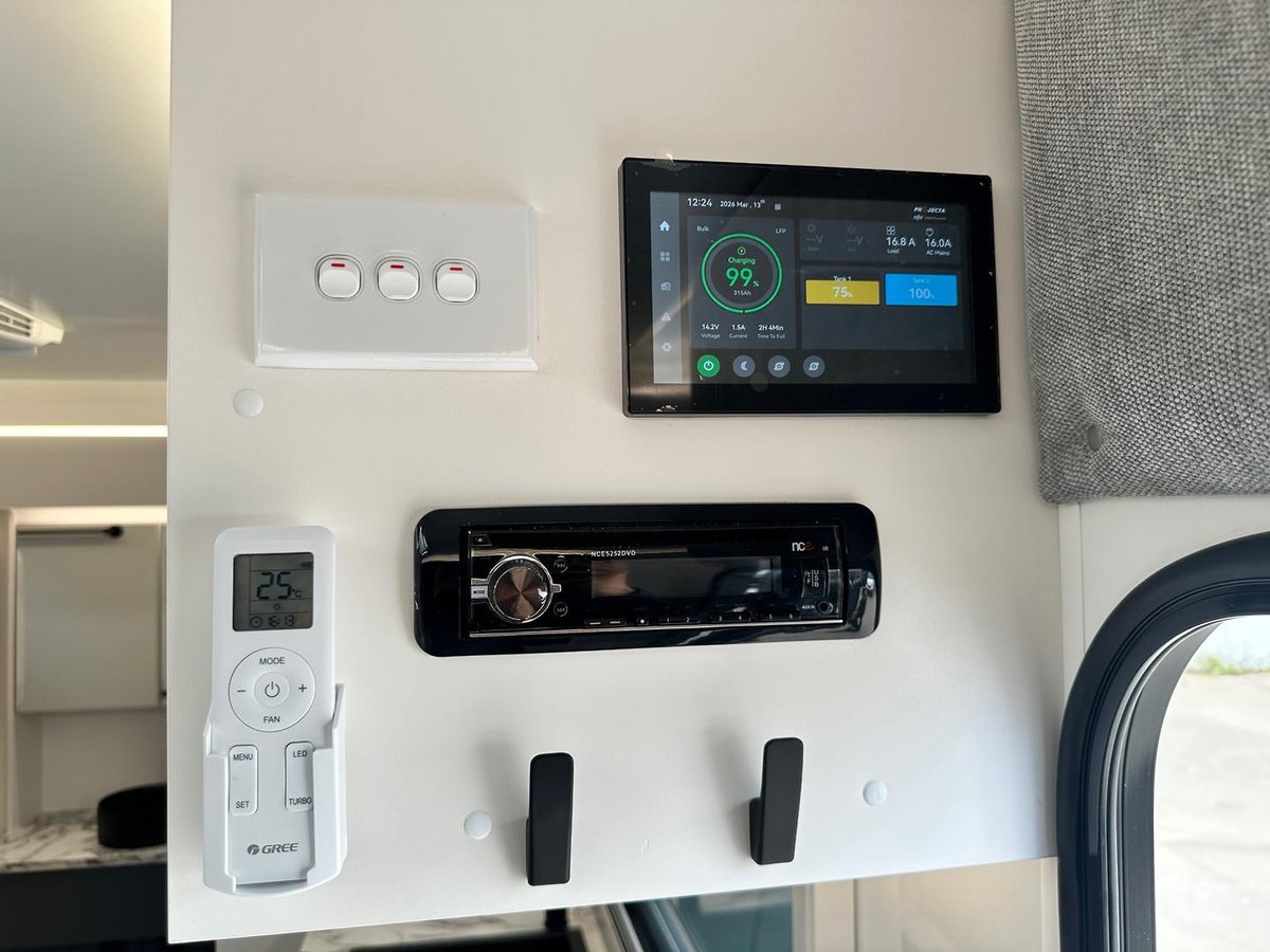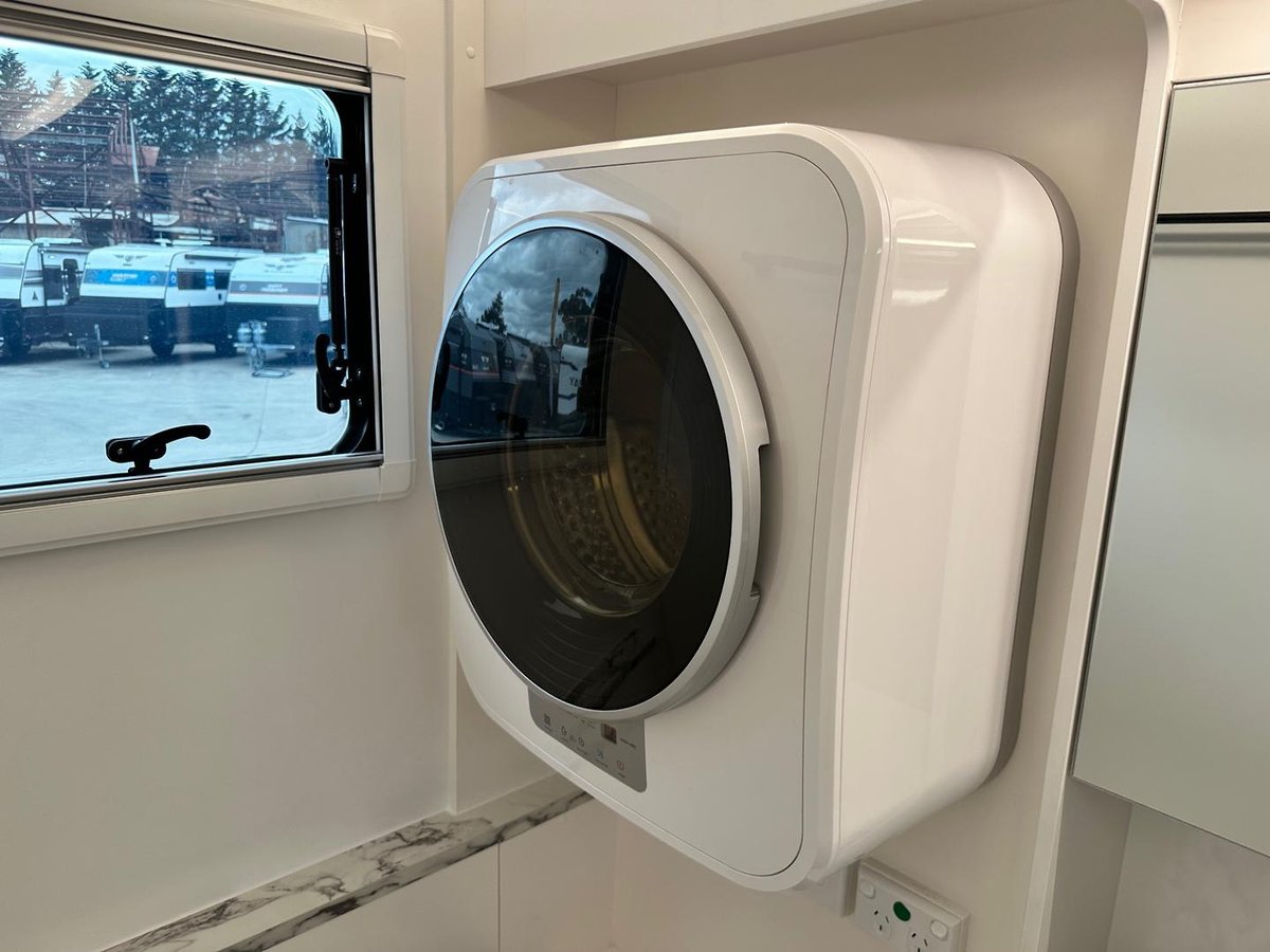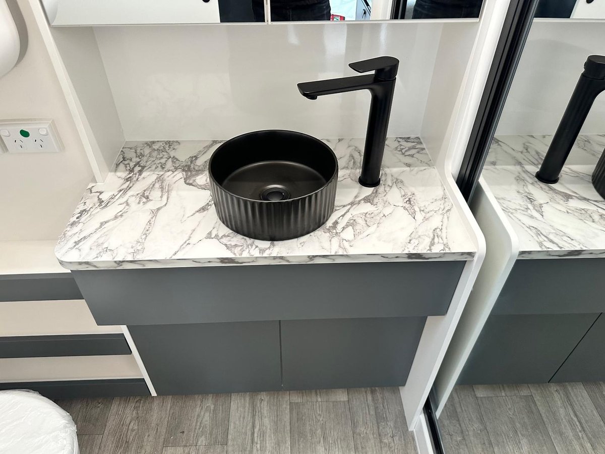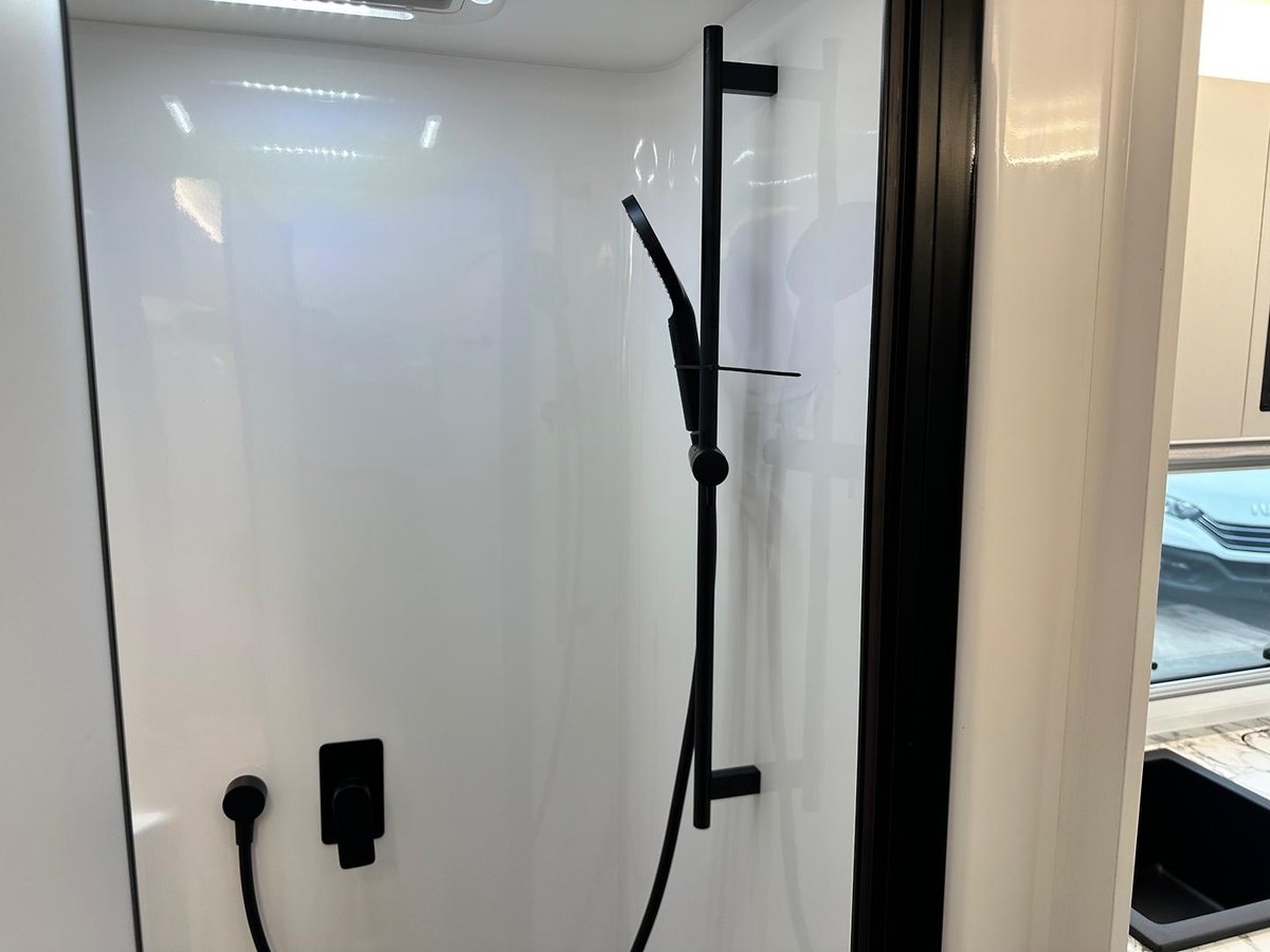 This year’s model debuts a new curved robe design, thicker 25mm benchtops, and a relocated kitchen to the doorside for improved flow. The toilet has been repositioned to the roadside, creating a more efficient interior layout. Convenience is built in, with internal and external USB-C charging, a single-bowl sink without drainer, and acoustic paneling that enhances interior comfort and style.