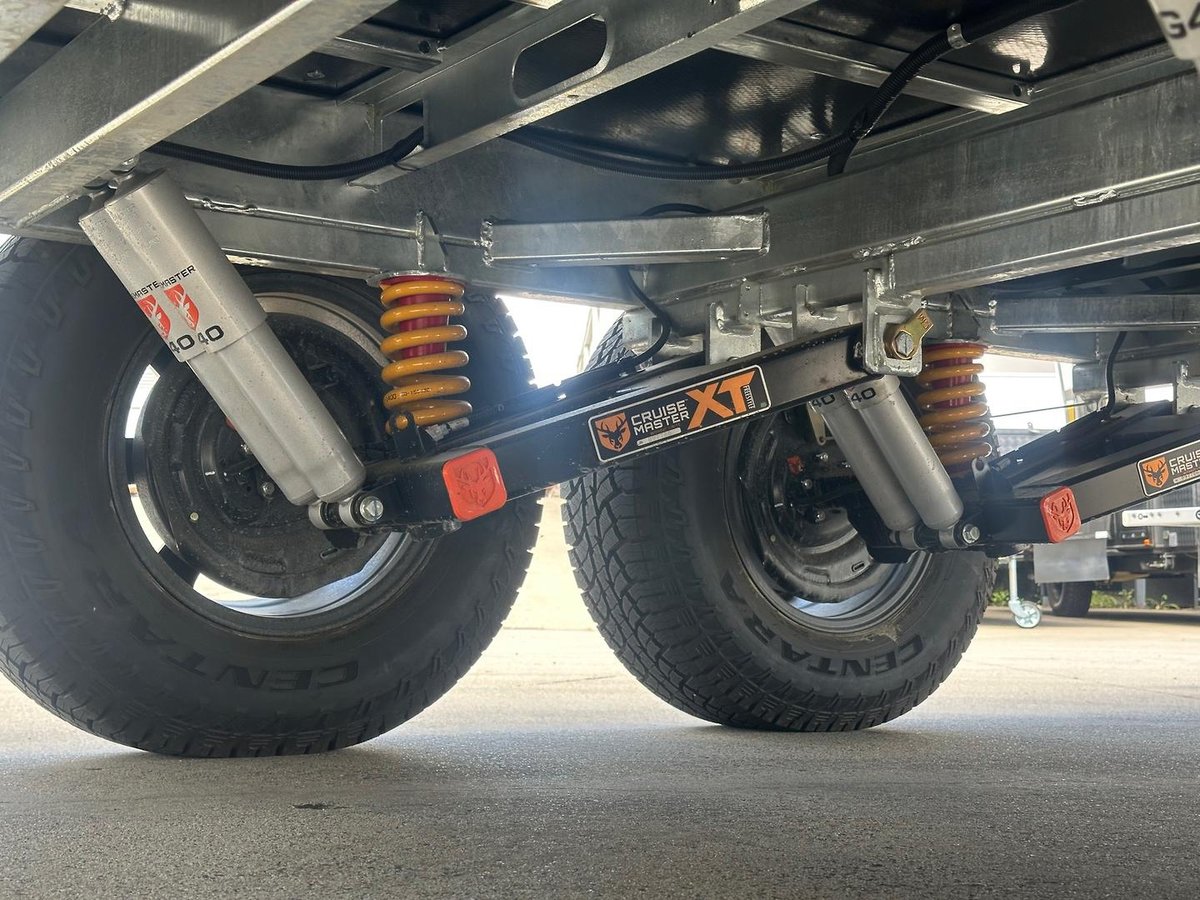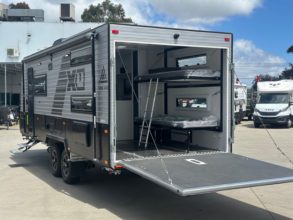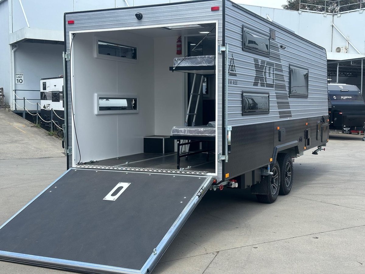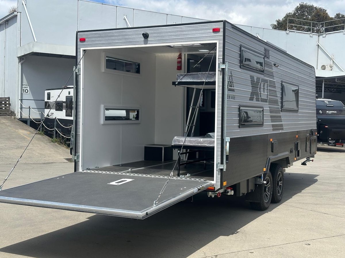 Newages amazing toy hauler has just hit our dealership and is ready for immediate delivery. Constructed in a tough, off-road ready alloy frame encased with alloy composite panels. You’ll be having your cake and eating it too, with a queen-size bed, ensuite amenities and a spacious club lounge, forward of a handy garage with a drop-down ramp.